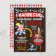 Invitaciones para la fiesta de la piscina y barbacoa de madera rústica. Cuenta con una parrilla roja, bebida afrutada y salpicaduras de agua, la parte trasera tiene un patrón de gingham rojo y más salpicaduras de agua. Ideal para una fiesta de cumpleaños de verano, compromiso o fiesta de graduación de adultos.