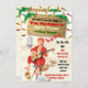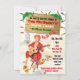 Consigue tu Hillbilly, redneck o Trailer Trash con esta increíble invitación. Una ilustración vintage de una chica llena de curvas es reelaborada en esta invitación de fiesta de Navidad con un viejo letrero de madera, zarigüeya colgante, luces de Navidad horteras, guirnaldas y moonshine. Un perrito se aleja de ella cantando. Cambia el texto a una fiesta de cumpleaños, fin de semana de chicas o fiesta de jubilación.
