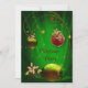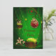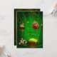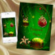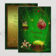 Invitaciones para la fiesta de Navidad con adornos de Navidad rojos y verdes, adornos dorados, acebo y regalos de elefante blanco.