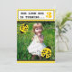 Las invitaciones para fiestas temáticas de cumpleaños con temática moderna y estilizada incluyen un diseño de fotos de personalizable, modelos de ladybugs, tipografía y puntos de polka en un esquema de paleta de colores amarillo, blanco y negro.