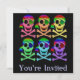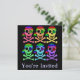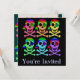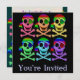 Tarjetas de invitación Personalizado de dos caras. Front tiene el personalizable "Estás invitado". Volver tiene información de invitación: introduzca el título del evento, la fecha, la hora, la ubicación y la información adicional o el mensaje personal. Patrón de seis cráneos y huesos cruzados en colores arcoiris (rojo naranja amarillo, con verde azul violeta debajo). Cada cráneo tiene un ojo arco iris y bandanas. Diseño de cráneo de pirata colorido y simple para Halloween o en cualquier momento.