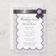 Hermosas invitaciones de fiesta con un patrón de damasco blanco y gris de cuero y un diseño de cinta negra con púrpura en la parte superior.