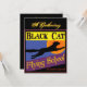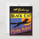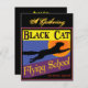 Arte de Halloween Retro de la Escuela de Voladores de Gatos Negros con un gato negro mágico sobrevolando un cielo azul con una luna naranja. Arte único de Halloween con arte vintage, diseño de etiquetas creativas que puedes personalizar para tus propias invitaciones de reunión.