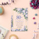 Honre a una mujer especial con esta elegante y femenina invitación de cumpleaños número 80. El número 80 está escrito en gran texto azul. Sigue la celebración de cumpleaños. El nombre de la invitada de honor también está en letras mayúsculas azules. El resto del texto es de un suave gris paloma. Los detalles de la celebración de cumpleaños están rodeados por un marco dorado chic decorado con rosas blancas y flores azules. Los elementos florales están ubicados entre profundas hojas verdes. Aunque es un diseño tradicional, el follaje botánico y el texto abierto y aireado le dan un toque contemporáneo. La parte posterior de la invitación es de un azul profundo apenas perceptible.