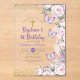Doble bautismo y primer cumpleaños Invitación a la Cruz Morada de Oro Floral de Púrpura