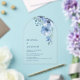 This elegant contemporary wedding invitation features watercolor painted blue flowers on a white background.