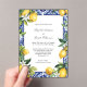Pretty yellow lemons with blue and white Mediterranean tiles and white florals Wedding invitation. See our Lemon Mediterranean Blue White Tile Italian Wedding Suite for matching products. All fields are editable to add your information.