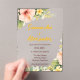 The transparent acrylic-style design creates a light, airy aesthetic while the warm script typography adds timeless romance. Perfect for beach weddings, garden ceremonies, destination celebrations, or couples who love bold florals with refined presentation. Order yours today.