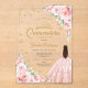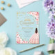 Blush pink gold Quinceanera celebration invitation. Features brunette girl in ball gown dress, script font, gold butterflies, pink roses and tiara. Perfect for an elegant princess style glam celebration. Personalize with your own details. Stylish transparent or frosted acrylic invitations.