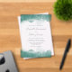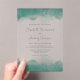 Un diseño sencillo y moderno con bordes de acuarela verde azulados en la parte superior e inferior. Los nombres de la pareja aparecen en un elegante guión de escritura a mano gris carbón, con el texto restante en letra sans serif en un fondo transparente claro.