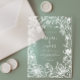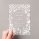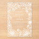 Esta elegante invitación a la boda presenta un marco botánico a mano de flores, hojas y fresas silvestres en blanco sobre un claro fondo transparente. Personalizar el texto de inspiración blanca con sus nombres y detalles bodas.