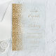 El borde izquierdo de esta elegante y moderna invitación a la boda tiene un diseño purpurina de imitación dorada. El texto del personalizable combina la escritura a mano de color dorado, las fuentes de copperplate y cursiva en un fondo transparente claro.