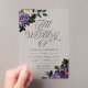 Invitaciones de boda florales temperamentales elegantes que presentan ramos de flores púrpuras y marfiles, exuberante follaje verde y bayas oscuras en las esquinas con un fondo de acrílico esmerilado o transparente. "La boda de" se muestra en tipografía elegante y moderna. Personalice la invitación de boda floral púrpura con sus nombres y detalles de la boda. El diseño se coordina con nuestra colección de boda floral gótica temperamental.