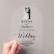 Esta elegante invitación a una boda en arco acrílico en blanco y negro es perfecta para un boda moderno. El diseño es sencillo y cuenta con una elegante caligrafía negra y un ilustracion de novias y novios con un fondo transparente y claro.