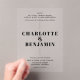 Estas modernas y elegantes invitaciones acrílicas bodas presentan una audaz tipografía negra sobre una base acrílica clara, con un diseño elegante y sofisticado. Perfecto para las parejas contemporáneas que buscan una invitación elegante y minimalista, estas tarjetas acrílicas exudan lujo y encanto intemporal. El diseño limpio y el sorprendente contraste hacen que estas invitaciones sean ideales para celebraciones formales o modernas, asegurando una memorable introducción a su día especial. Con su diseño distintivo, equilibran perfectamente elegancia y simplicidad.