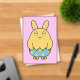 Una chica gordita, sin impresionar, vestida como conejito, mitad dentro de un huevo decorado—La Pascua nunca se ha visto tan aburrida!