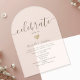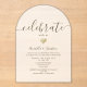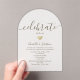 Invitación de boda de acrílico simple y moderna con fondo transparente esmerilado y corazón dorado romántico. Elegante y minimalista, perfecta para la recepción de boda 'Celebra Con Nosotros'.