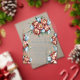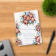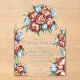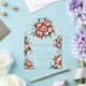Un ramo de flores muy bien ilustrado. El ramo se compone de grandes peonías vibrantes en tonos terracota y azul, complementadas con pequeños tulipanes azules. También hay hojas verdes y acentos dorados, posiblemente representando tallos u otros elementos florales. Las flores están centralmente colocadas, con un par de anillos dorados entrelazados entre ellas. Toda la composición se sitúa sobre un fondo blanco, destacando los colores y detalles de las flores.