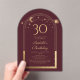 Astronomía del Celestial Red Gold Sun Moon 30th Birthday Acrylic Invitation presenta un elegante sol dorado, luna y estrellas con un marco dorado sobre un fondo rosado profundo. Adentro está tu personalizado la información de la invitación por trigésimo cumpleaños. Personalice editando el texto en los cuadros de texto. Diseñado por Evco Studio www.zazzle.com/store/evcostudio