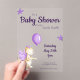 Una agradable invitación a la ducha de bebé con una sensación de cuento de hadas. El lindo ilustracion de un bebé dragón sosteniendo un globo violeta será la delicia de la madre. Ilustrado y diseñado por Patricia Álvarez.