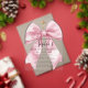 Blush pink watercolor coquette bow is decorated with roses and sage green greenery. A gold cross is placed above the text. The back is a chic pink and white stripe pattern. Your daughter's name is written in a beautiful calligraphy script. All text is editable.