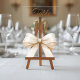 Personalize and your table numbers one by one. A clear background decorated with a large cream, beige colored bow.