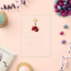 Esta elegante invitación a la primera comunión incluye una cruz de Relieve metalizado de imitación dorada decorada en su base con un ramo de flores rojas flanqueado por un delicado Relieve metalizado de imitación de oro y follaje purpurina. El texto del personalizable combina el guión de escritura a mano color oro claro y el tipo de letra de copperplate en un fondo claro.