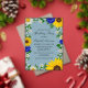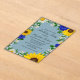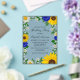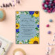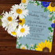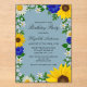 Invitación de cumpleaños campestre rústica con girasoles vibrantes, margaritas blancas tradicionales y flores azules sobre un fondo azul con acentos de bebérespiración y vegetación botánica