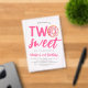 Invite a los huéspedes a su fiesta de 2º cumpleaños con estas dulces invitaciones de cumpleaños con temática de donut. La encantadora fiesta de cumpleaños invita a incluir la frase "Dos dulces" con letras rosas brillantes, y el "o" se sustituye por un donut acuarela rosa adornado con rociadores multicolores. El diseño se basa en un fondo acrílico escarpado o transparente. Personalice las dos invitaciones dulces de cumpleaños de donut con el nombre de su hijo y los detalles de su fiesta, ¡convirtiéndolas en el regalo perfecto para la celebración especial de su hijo!