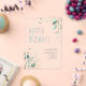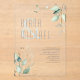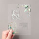 Delicados arreglos de vegetación inspirados en la naturaleza, incluyendo eucaliptos de goma azul con salpicaduras de dorado y de hojas de oro junto con diseños únicos, hacen de este hotel un emocionante boda para cualquier época del año. La invitación a la boda acrílica transparente que se muestra aquí incluye frondosos bordes fológicos y una gran variedad de manchas verdes suaves. Vea el vínculo de colección en esta página para ver todos los elementos coincidentes de este hermoso diseño o busque ID817 para ver otras piezas y opciones de color para este conjunto.
