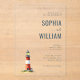 This elegant wedding invitation features a centered layout with a wooden background, creating a warm and inviting atmosphere. The design includes a charming illustration of a red and white lighthouse on a small rocky island, adding a touch of coastal charm. Serif fonts are used for the text, providing a classic and sophisticated look, while customizable placeholders allow for personalization with names, dates, and locations. The overall style is formal yet approachable, perfect for couples seeking a refined and personalized wedding invitation.