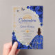 Royal blue gold Quinceanera celebration acrylic invitation. Features brunette girl in ball gown dress, script font, gold butterflies, roses and tiara. Perfect for an elegant princess style glam celebration. Personalize with your own details. Stylish transparent or frosted acrylic invitations.