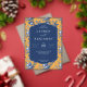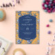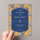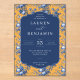 This elegant wedding invitation features a vintage-inspired design with a mustard yellow background adorned with blue floral motifs and green foliage accents. The central navy blue panel, framed by a white border, showcases the event details in a mix of serif and script fonts, creating a sophisticated and romantic feel. Perfect for couples seeking a classic yet modern aesthetic, this invitation captures the essence of celebration and nostalgia, making it ideal for a memorable wedding occasion.