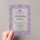 This elegant 18th debut acrylic birthday invitation has purple glitter scrollwork, a purple tiara crown, and a clear background with a personalizable template to create your own message. The invitation template is customizable in the listing editor. The formal design is a classic way to set an elegant tone for your milestone birthday celebration.