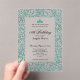 This elegant 18th debut acrylic birthday invitation has teal glitter scrollwork, a teal tiara crown, and a clear background with a personalizable template to create your own message. The invitation template is customizable in the listing editor. The formal design is a classic way to set an elegant tone for your milestone birthday celebration.