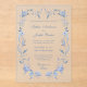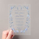 Estas elegantes y claras invitaciones a bodas acrílicas cuentan con un polvoriento marco floral de color azul polvoriento vintage con bonitas hojas botánicas, una caligrafía elegante y un texto clásico. El diseño de la tela azul francesa le dará un toque romántico y de moda a su papelería boda.