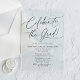 Celebre a su graduado con nuestras Elegantes Invitaciones de Graduación de Acrílico "Celebrate the Grad". Con la leyenda "Celebrate the Grad!" en una sofisticada tipografía de caligrafía negra, estas invitaciones están diseñadas sobre un fondo de acrílico helado o transparente para un aspecto moderno y elegante. Personalícelas con el nombre del graduado, el nombre de la escuela, el año de graduación y los detalles de la fiesta para crear un anuncio único y memorable. Perfectas para graduados de secundaria y universidad, estas invitaciones son una forma elegante de honrar este importante logro.