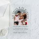Elegante y claro montaje acrílico o invitación boda privada e invitación a la recepción con su foto en un marco de arco y "Come Bebida & Be Married" en la típica tipografía de la región de Seria. Bajo la foto, personaliza los detalles de la invitación de invitación y recepción y agrega tus nombres en un guión tipo firma.