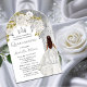Elegante y elegante blanco con acentos plateados de masa floral combinados con un panel arcaico sobre un blanco descolorido a claro, brillante fondo purpurina de color plateado "Quinceañera" diseño fiesta. Tiene una bella morena de color marrón oscuro a negro en un florido vestido de bola blanco y plateado. Diseño compuesto por Holiday Hearts Designs.