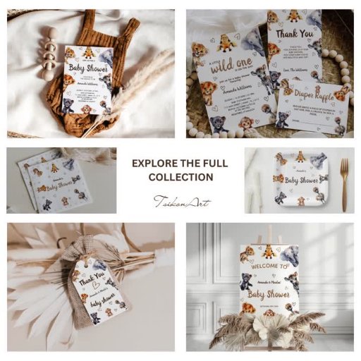 La invitación para la fiesta de bebé de Safari Animal es un conjunto encantador que presenta ilustraciones encantadoras de acuarela de varios animales adorables de la jungla: jirafa, elefante, león, tigre, avestruz, cebra y mono, todos representados en tonos suaves y vibrantes de acuarela. Cada animal aporta un toque de fantasía y diversión a la celebración, lo que lo hace perfecto para una fiesta de bebé con tema de jungla.