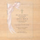Elegant First Holy Communion invitation featuring a pink coquette bow design printed on modern acrylic. Perfect for celebrating your daughter special sacrament with a soft, feminine, and graceful style. Ideal for Catholic church celebrations, family gatherings, and formal communion parties. Editable text. Premium acrylic finish.