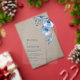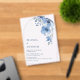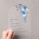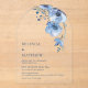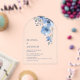 Esta elegante invitación de boda contemporánea presenta flores azules pintadas con acuarela sobre un fondo blanco.