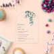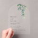 Esta elegante invitación de boda contemporánea minimalista con arco presenta hojas de eucalipto pintadas con acuarela sobre un fondo transparente claro.