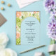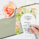 Las invitaciones a bodas acrílicas LIMPIAS o FROSTADAS incluyen los detalles de tu ceremonia con letras de moda rodeadas de un arco verde salado y hermosas flores acuáticas que incluyen hortensias blancas y verdes, rosas rosas y cremas, margaritas, tallos pequeños y hojas. COINCIDIENDO elementos de nuestra colección.