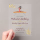 Única y elegante invitación de acrílico de cumpleaños en colores rosa y dorado*. La invitación tiene una forma de corchete y tiene toda la información que necesita editar para su fiesta. En la parte superior e inferior de la página se pueden encontrar algunas hojas de oro para decorar la invitación. La parte superior de la invitación tiene a un chica afroamericano negro con una leotardo rosa dividiéndose en un rayo. Ella tiene el pelo en un trasero y está feliz con su ejercicio. Todo el texto está en un muy hermoso color rosa mudo y para separar la fecha del resto del texto hay un par de cordones de color oro*. *ten en cuenta que el oro no es en realidad Relieve metalizado sino impreso en ese color. Ilustrado y diseñado por Patricia Álvarez.