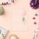 Invite a los amigos y a la familia con estilo y establezca el tono de su día especial con esta encantadora invitación de cumpleaños. El diseño presenta un globo rosa con hojas de eucalipto.