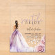 Esta invitación a la ducha de novia presenta un diseño romántico y elegante, con una suave lavanda y una paleta de colores pastel. A la izquierda hay un ilustracion acuarela de una novia con un vestido morado que fluye, complementado con delicados acentos florales como rosas rosas rosas rosas rosas rubias. La mezcla de escritura fluida y fuentes serif limpias añade un toque moderno pero sofisticado, creando una estética onírica y femenina perfecta para una celebración de moda.