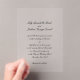 Invitación acrílica boda de estilo clásico con un diseño sencillo y de moda con los detalles del evento en un guión elegante de caligrafía.