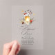 Establece el tono para tus celebraciones de boda con esta hermosa invitación de cena de ensayo transparente de acrílico que presenta un diseño acogedor de linterna de invierno. Rodeada de acebo, piñas, bayas y un pájaro posado, esta invitación encarna el encanto de una celebración rústica de invierno o Navidad. Totalmente personalizable, es perfecta para parejas que planean una cena de ensayo estacional cálida y elegante.