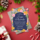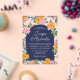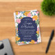 A unique wedding invitation for a vibrant, colorful wedding with a strong color palette. The eye-catching flowers in pink and yellow crowd the arch-shape on which your wedding wording is written. Your names in a modern signature script. The dark blue arch-shape is printed on acrylic, with a transparent background full of flowers.